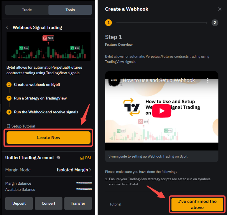 Step 2: Click on Create Now. Please make sure you understand the overview of this function. For more information about how to run webhook signal trading, consider watching the tutorial video provided and click on I’ve confirmed the above.