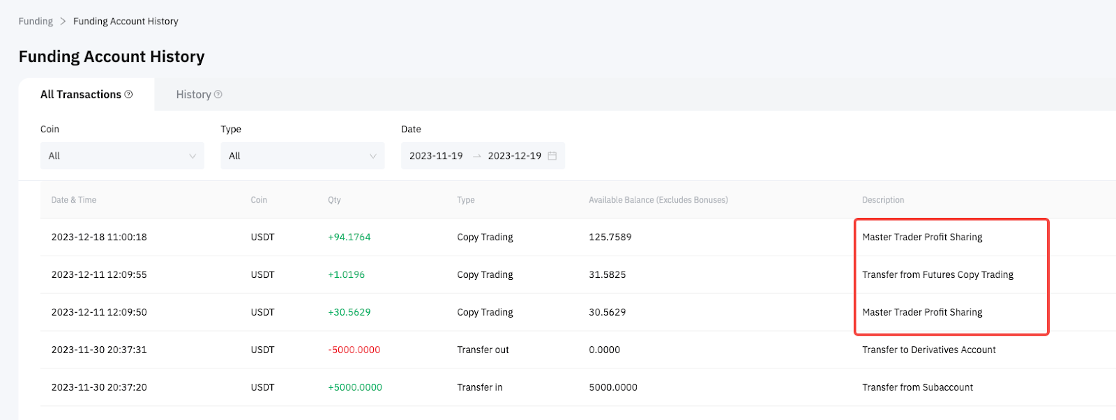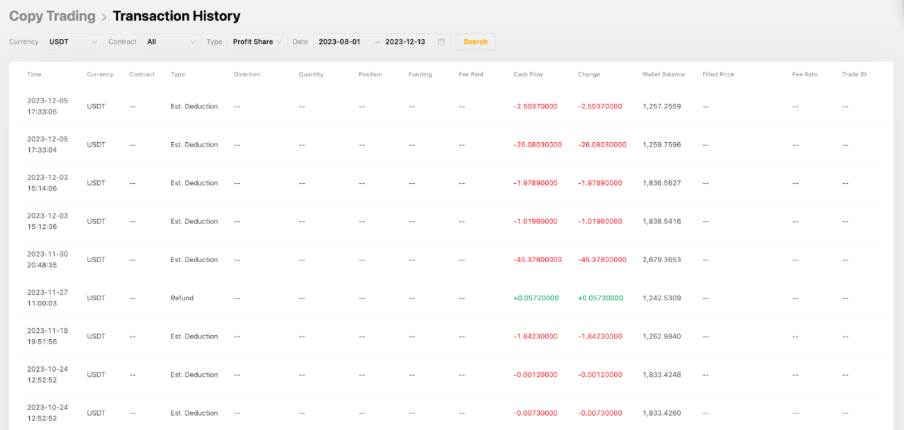 You can see the deduction record and refund from the Copy Trading Transaction History page.