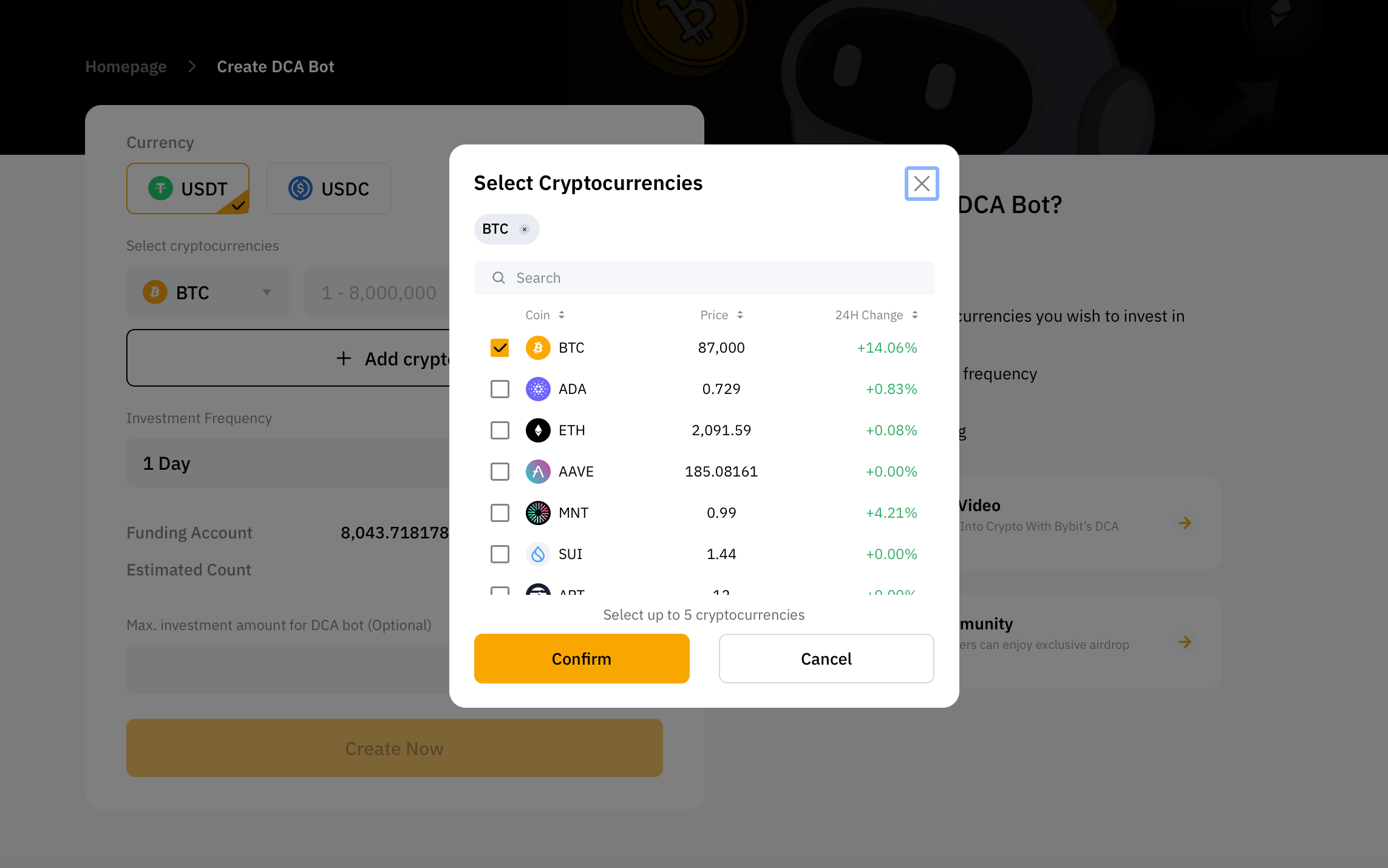 Currently, USDT and USDC are supported. Please note that one DCA bot cannot use two investment currencies simultaneously.