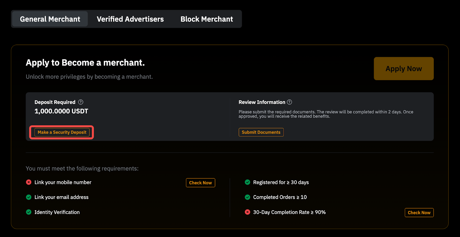 5. For a General Advertiser, the required security deposit is 200 USDT. For higher-level advertiser types (e.g., Verified Advertiser or Block Advertiser), the necessary deposit is 1,000 USDT.