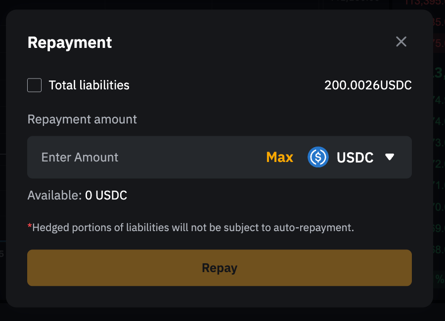 Note: If you have a borrowed coin in your available balance, the asset will be automatically selected for repayment.