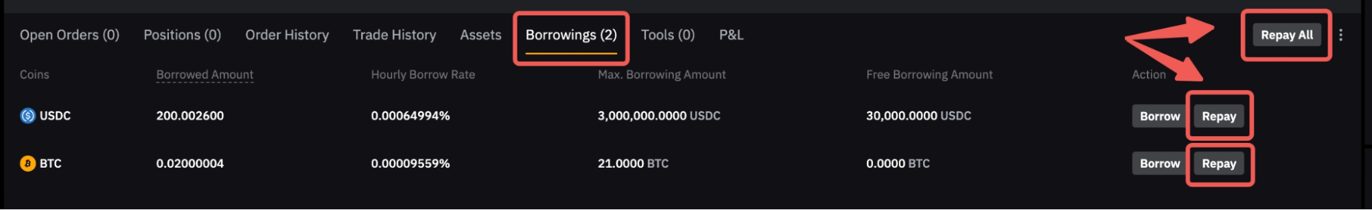 • To repay all borrowed coins, click on Repay All at the top of the Unified Trading page.