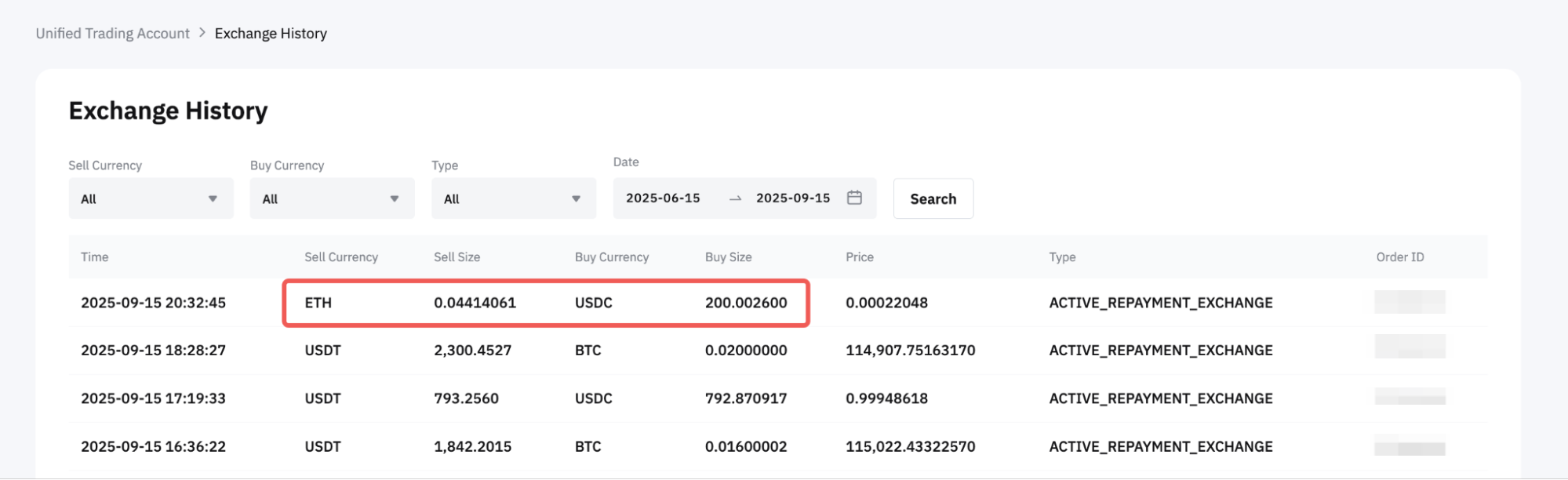 In your Transaction Log, you can find details for each repayment under the Convert and Repay transaction types—sequentially listed with identical timestamps and Order IDs. Convert transactions indicate any auto-conversions of selected collateralized assets to repay the borrowed amount. It will only appear if you have an insufficient borrowed coin in your balance for repayment, and conversions are necessary. Meanwhile, Repay transactions display the amount you have paid for your borrowed coin.