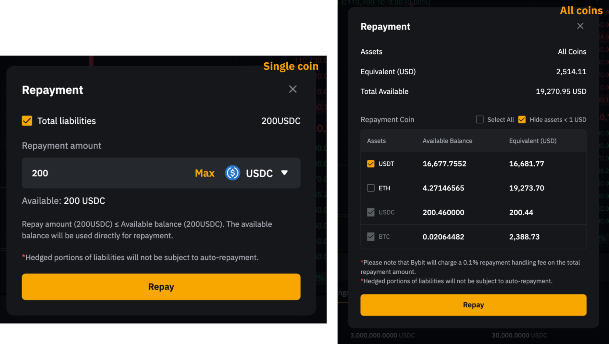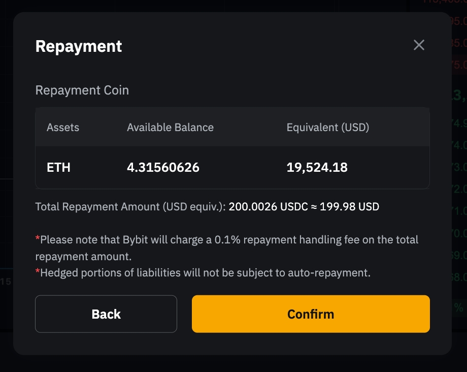 Upon confirmation, the system will use your available borrowed coin for repayment first. Any remaining liabilities will be repaid by converting collateral assets into the borrowed currency. If the repayment requires conversion, Bybit will charge a 0.1% handling fee on the total repayment amount.