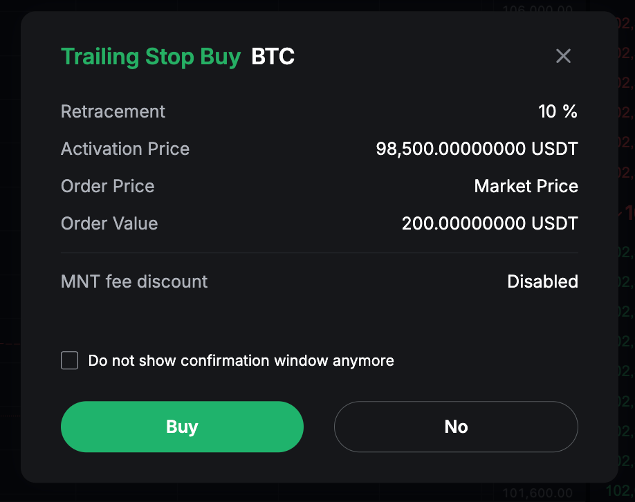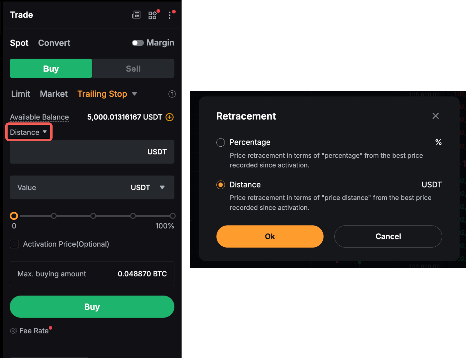 Trailing Stop in Spot and Margin trading is a dynamic order type that functions as an enhanced feature for Buy and Sell. It operates as a stop order that tracks the market price of an asset or position and automatically adjusts the stop order to minimize loss or lock in profits as the price moves in the trader's favor. Once the Trailing Stop is determined, if the market price reaches a certain level and then retraces back by a predetermined amount set by the user, a market order will be triggered.