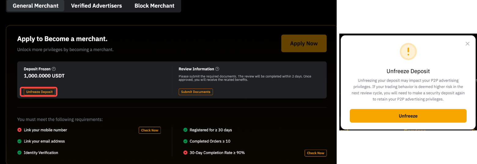 — Ten en cuenta que la liberación de tu depósito de seguridad implica perder el privilegio de publicar anuncios P2P. Para obtener más información, consulta las preguntas frecuentes: Requisitos de depósito de seguridad en trading P2P.
