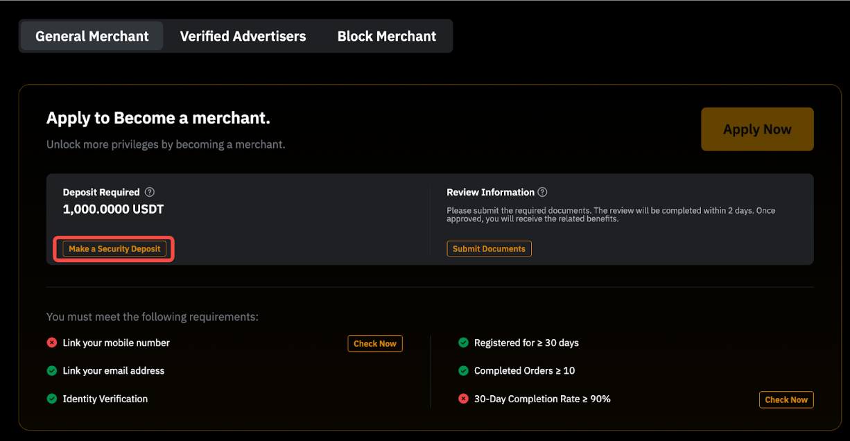 Paso 1: Ve a la página Privilegios del anunciante en el sitio web de Bybit, desplázate hasta la parte inferior y selecciona el tipo de anunciante que deseas ser.