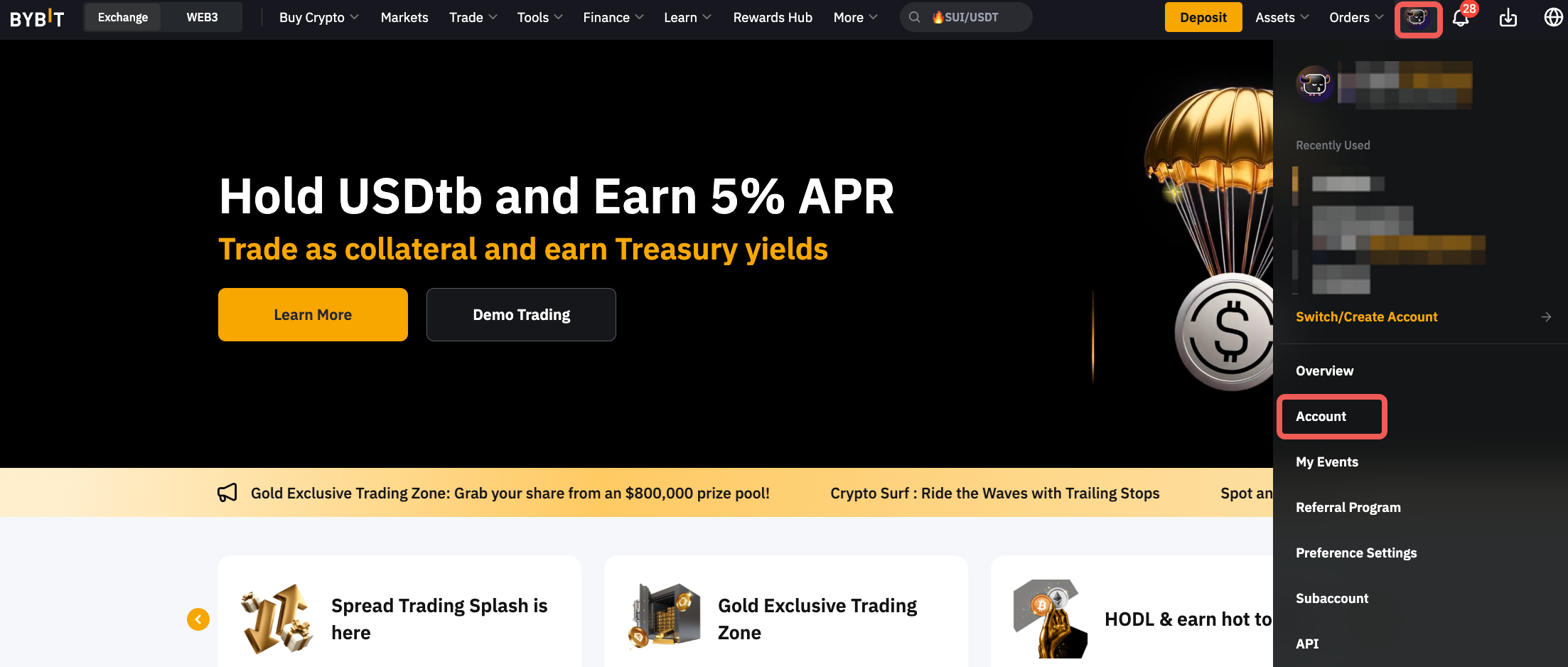 Step 1: Log in to your Bybit account. On the homepage, click Account.