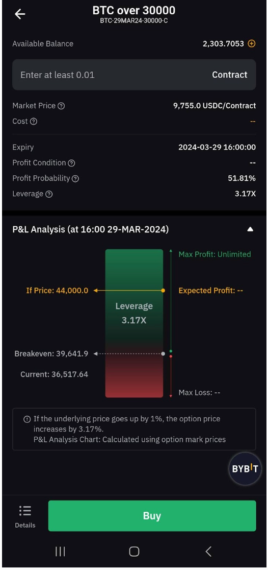 Además, los traders pueden pulsar el botón Detalles en la esquina inferior izquierda para ver información importante como el nombre de la opción, el precio actual de compra1/venta1, el volumen de trading de 24 horas del contrato y el cambio de precio de 24 horas (%).