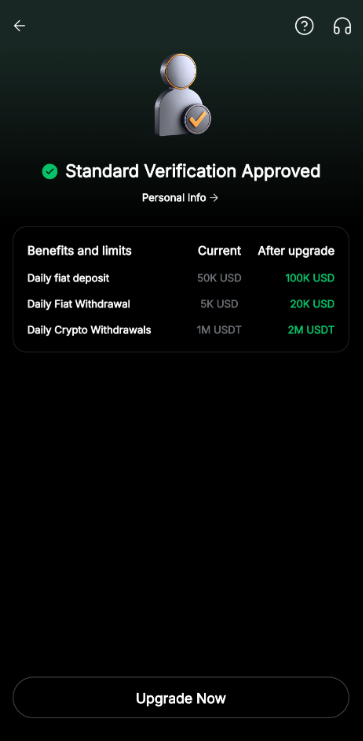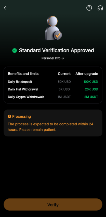 標準的な本人確認が完了すると、認証センターのページに認証済みラベルが表示されます。入金して取引を開始できるようになりました。詳細については、以下の記事を参照してください。よくある質問 — 個人KYC