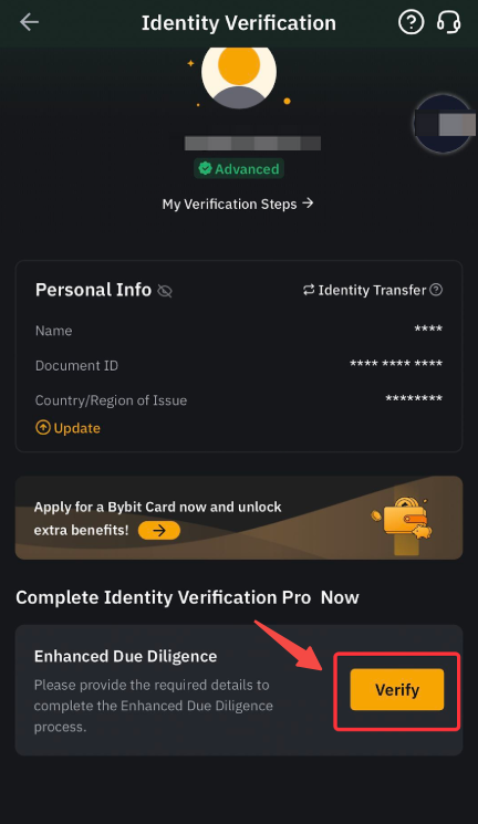 Proレベルの本人確認を完了するには、「確認」をクリックして、詳細を入力して、拡張デューデリジェンス(EDD)プロセスを完了します。EDDでは、アンケートに回答し、収入証明の裏付け書類を提出する必要があります。