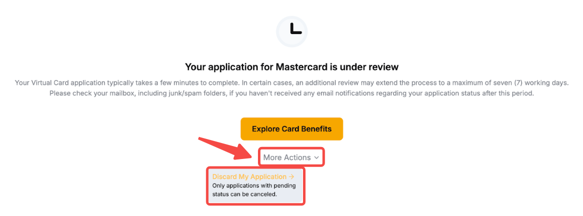 You can cancel your Bybit Card application by clicking on View my application → More Actions and selecting Discard My Card Application