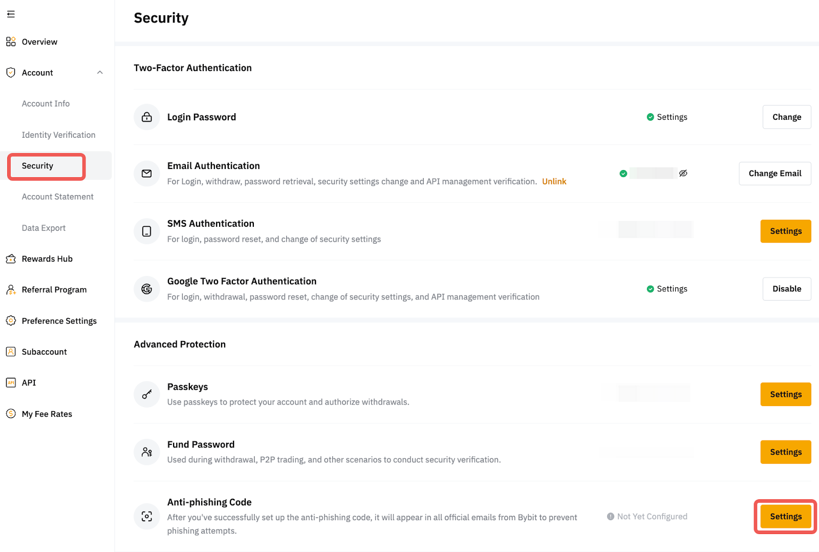 Para modificar seu código anti-phishing atual na Bybit, toque em Segurança e clique no botão Alterar na configuração do código anti-phishing.