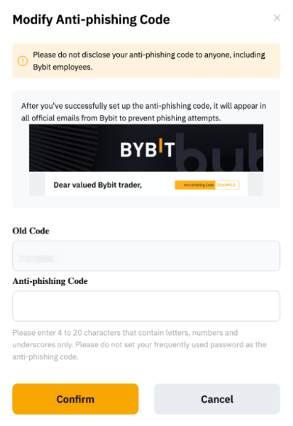 Всегда устанавливайте уникальный код защиты от фишинга на странице Аккаунт и безопасность. Этот простой шаг повышает безопасность аккаунта и позволяет лучше идентифицировать официальные электронные письма Bybit.