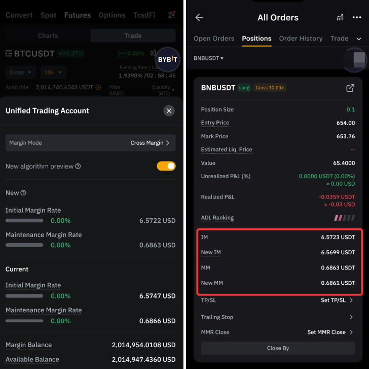 Старый алгоритм по-прежнему используется для расчета маржи. Пока новый алгоритм расчетов не будет постепенно внедрен со 2 сентября 2025 года, будут отображаться оба алгоритма расчета. Это позволит лучше понять уровень риска аккаунта и позиций в соответствии с новой логикой расчета и заранее управлять рисками.