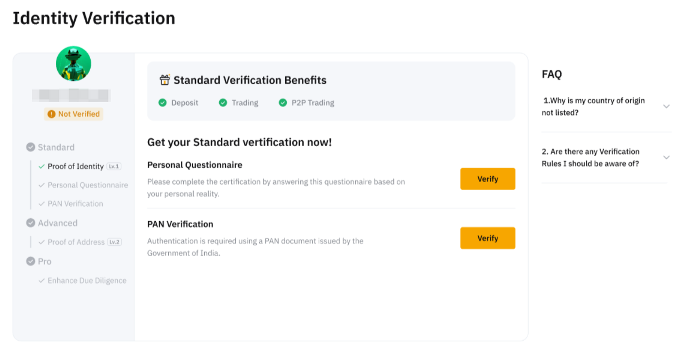 印度公民需要完成一系列个人问卷和永久账号 (PAN) 验证,作为标准验证流程的一部分。