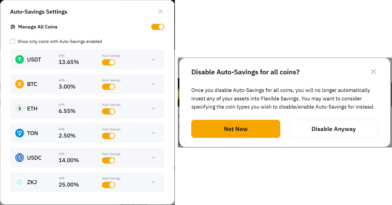 第 2 步:系统将跳转至自动理财设置页面。如需一次性关闭所有币种的自动理财功能,请关闭管理所有币种功能开关。或者,您也可以针对各币种逐一关闭自动理财功能。