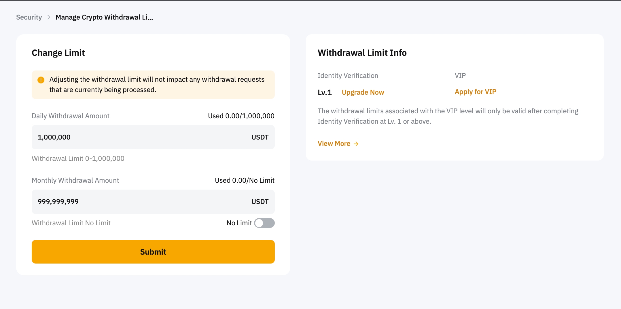 步驟 3:調整您的日限額或月限額,然後點擊提交。您將能夠在頁面右側看到您當前的提現限額信息。有關每個 VIP 和身份驗證級別的提款限額的更多信息,請訪問此處。