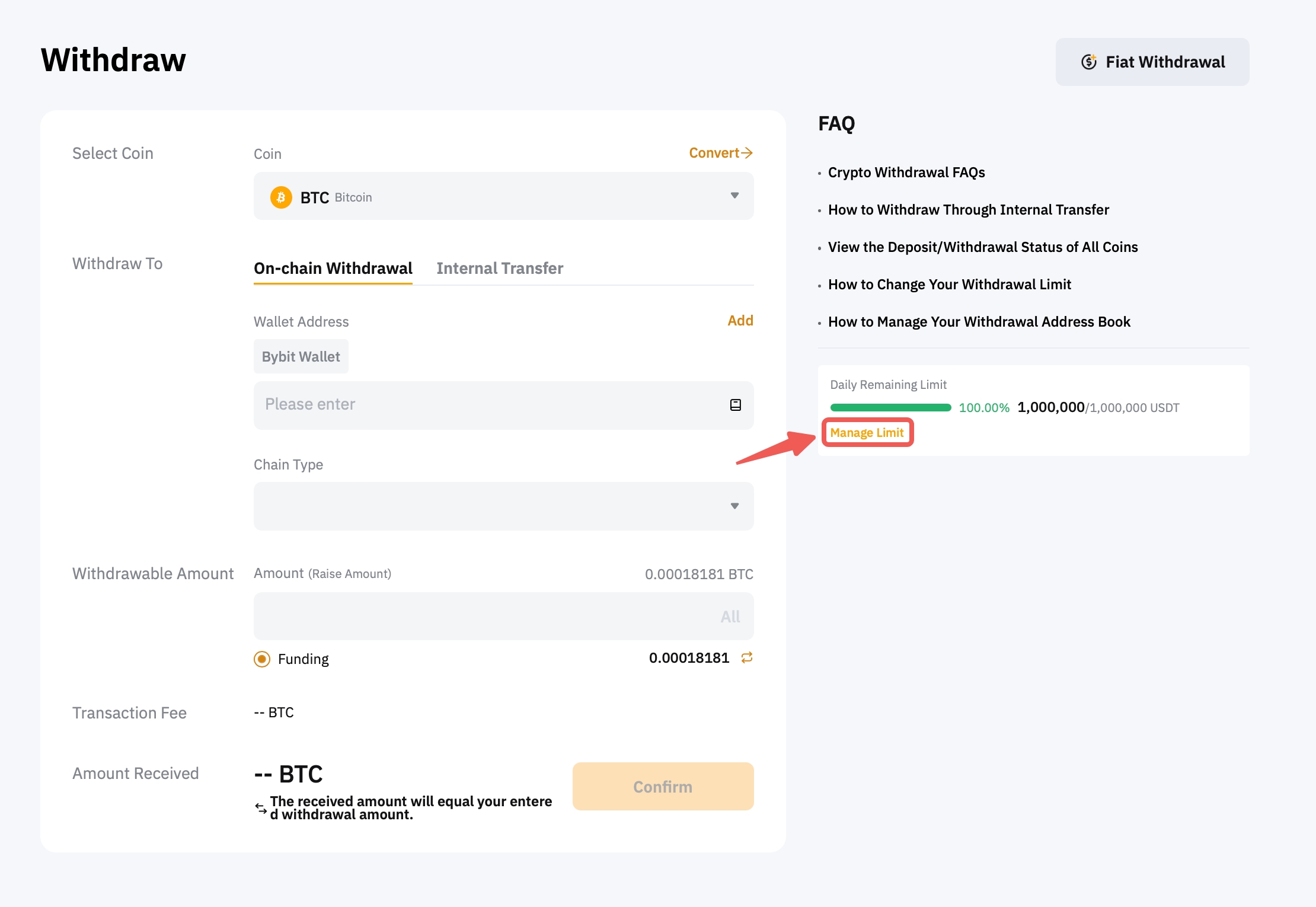 Bybit 允許用戶根據您的 VIP 級別和身份驗證級別在可用的最大提現限額內管理他們的每日和每月加密貨幣提現限額。查看各VIP及身份驗證級別的提現限額,請訪問此處。
