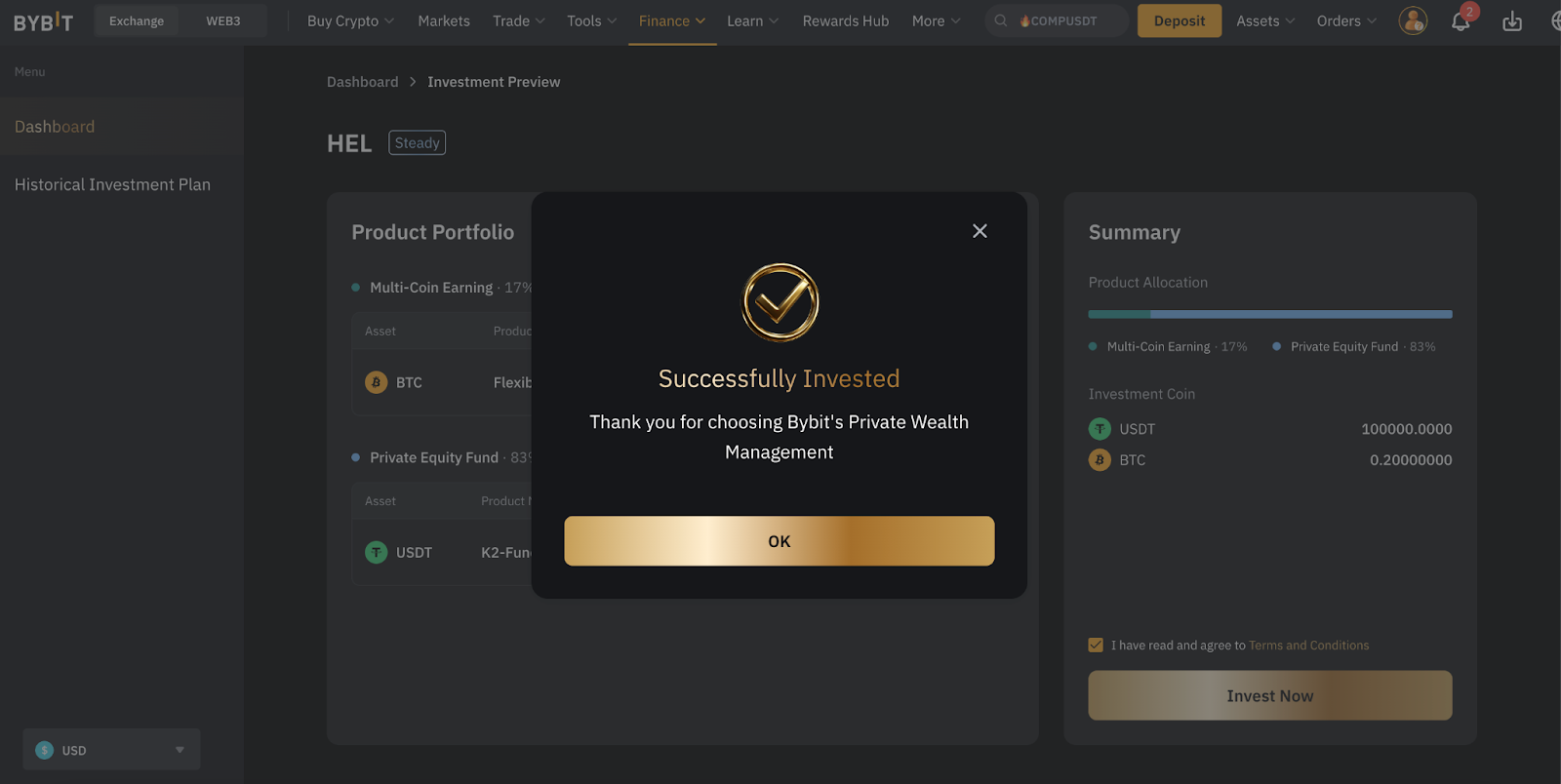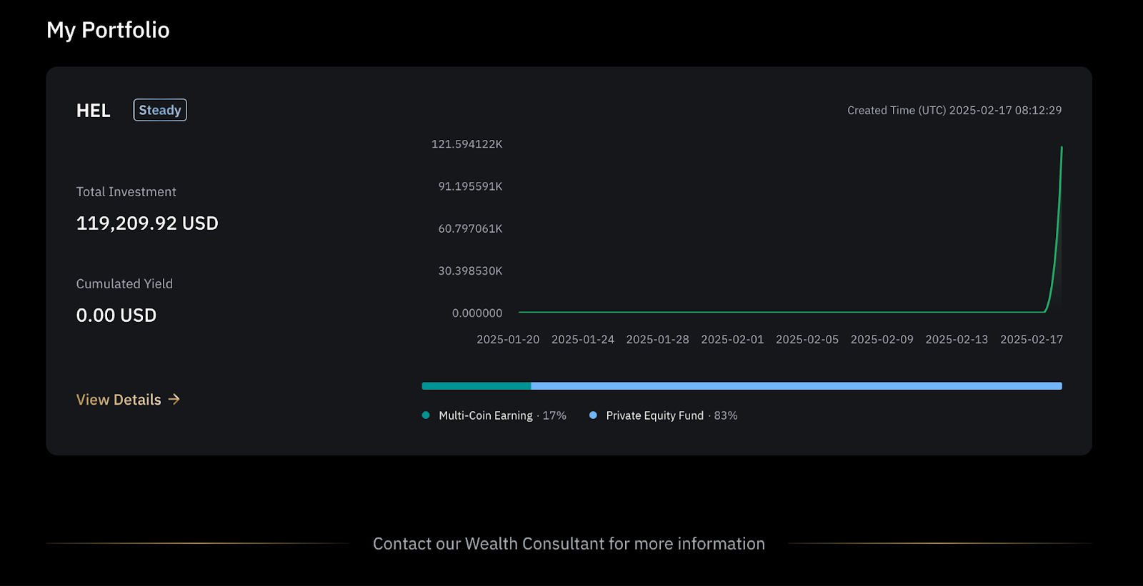 我們的專家會根據您的風險偏好和回報預期,為您配置優質加密貨幣資產與投資工具。一經確認,我們的私人財富管理團隊將最終敲定您的投資計畫,屆時您可前往個人 PWM看板進行查看。
